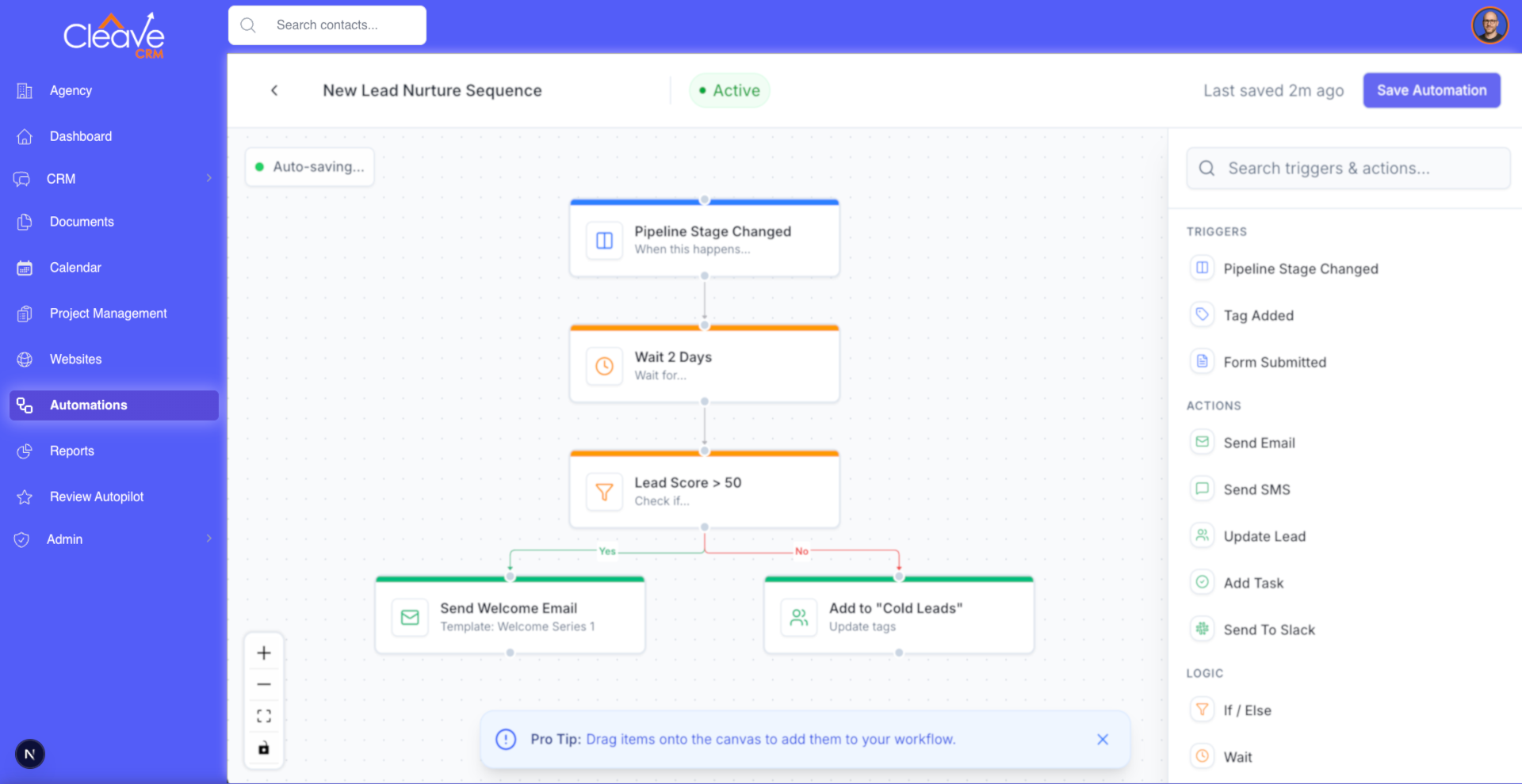 Automate follow-ups, task creation, and pipeline updates based on real activity—not just time delays. Cleave's automations connect calls, forms, calendars, and deals so the right actions happen automatically while your team focuses on conversations, not busywork.