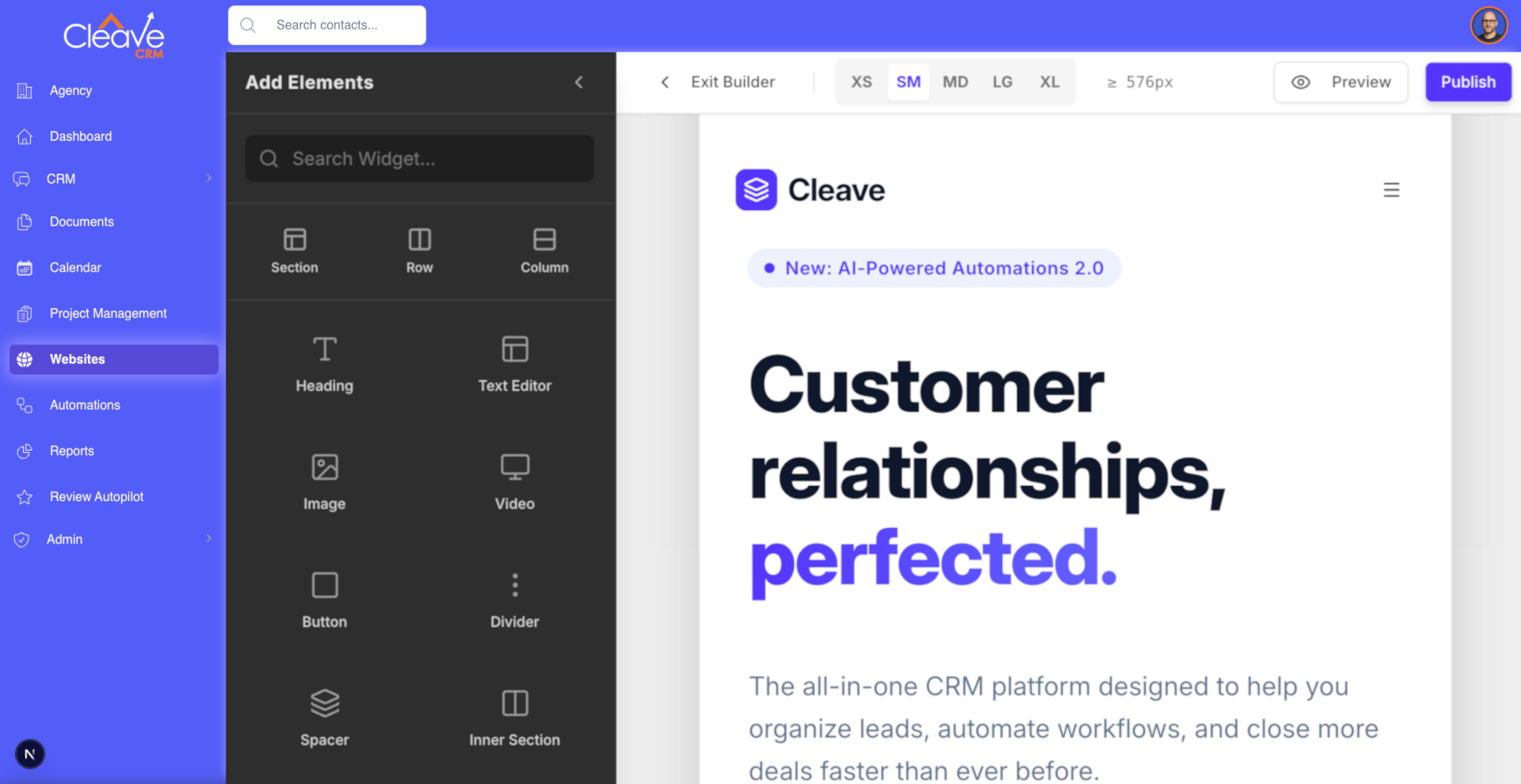Build landing pages and funnels with a drag-and-drop editor that lives inside Cleave. Host them on your own domain, drop in forms and calendars, and use variables to personalize content to the customer's viewing it. Every lead, booking, and action flows directly into your CRM and automations—no duct-taped integrations required. Cleave does it all.